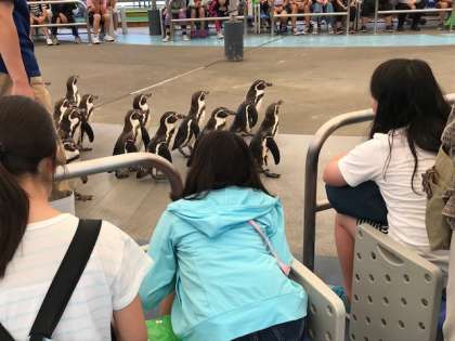 ペンギンのお散歩を見学しています。こんなに間近に見ることができます。とってもかわいいですね。