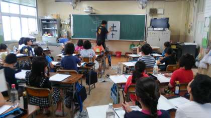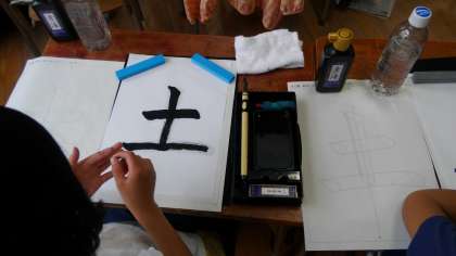 書写の授業です。「土」の文字を毛筆で練習していました。
