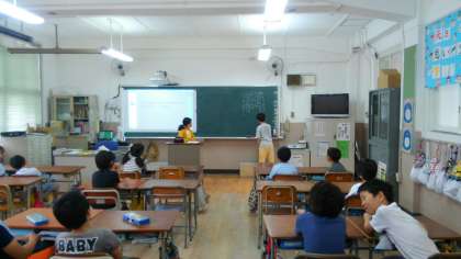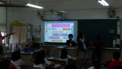 朝の学級活動の時間に、縦割り班で土曜学習参観(夏祭り)の出し物を、みんなで決めていました。