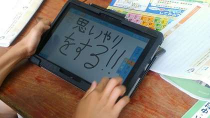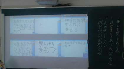 サッカーの試合があるので、友達と時間を約束していたが、遅刻してしまい、試合にも負けてしまったので、遅刻した友達が理由を言いかけたのに、許さなかった。実は、弟が病気になったので、看病していたため遅れてしまったのでした。それを知って、さあどうするか?どうすればいいのか?グループに分かれて話し合い、タブレットを使って発表していました。