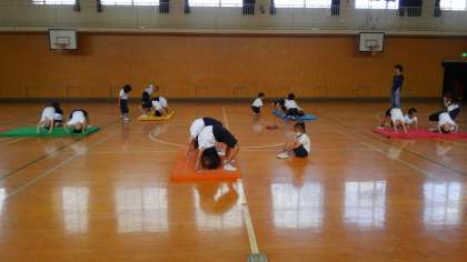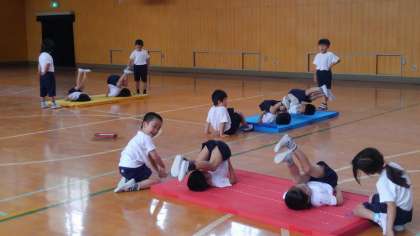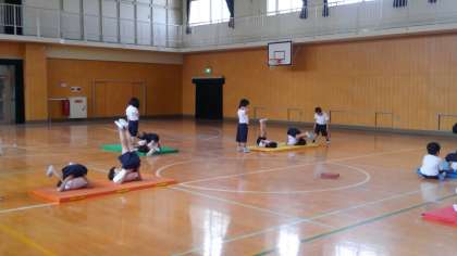ねこちゃん体操。2人組で友だちと助け合いながら、ブリッジもこしが上がるようになってきました。