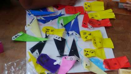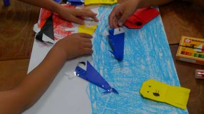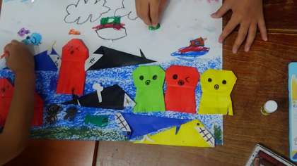 7月5日(木)折り紙でくじらとたこをおって画用紙に貼りました。クレパスや色鉛筆を使い、色をつけて「うみのいきものたち」をつくりました。班ごとに特徴のある作品ができました。