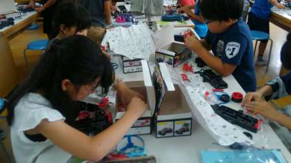 「電気のはたらき」の学習のまとめで、モ—タ—カ—を作りました。うまく直列つなぎにできたかな。