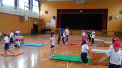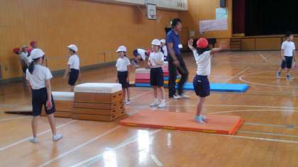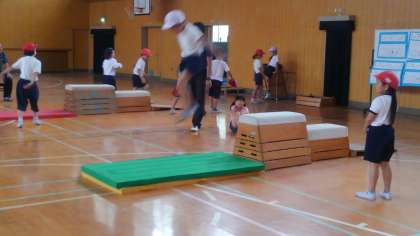 雨でプールができなかったので、体育館で跳び箱遊びをしました。跳び箱を使った運動経験が少ない子どもが多かったので、2学期に行う「開脚跳び」につながる運動遊びを行いました。はじめは高い場所に跳び乗ったり、跳び降りたりすることが怖かった子どもが多かったのですが、友だちの口伴奏を聞きながら繰り返すことによって徐々に恐怖心が消え、楽しむ子どもが増えてきました。