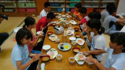朝食を食べています。今日は、朝から様々な活動に取り組むので、みんなしっかり食べましょう!