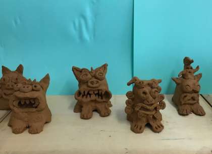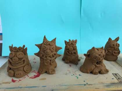 1学期の社会科で「あたたかい沖縄地方のくらし」を学習したときに、シーサーのことも調べました。自分や家族の守り神として、家にかざることができるような作品をつくろうと、みんな大はりきりでつくりました。