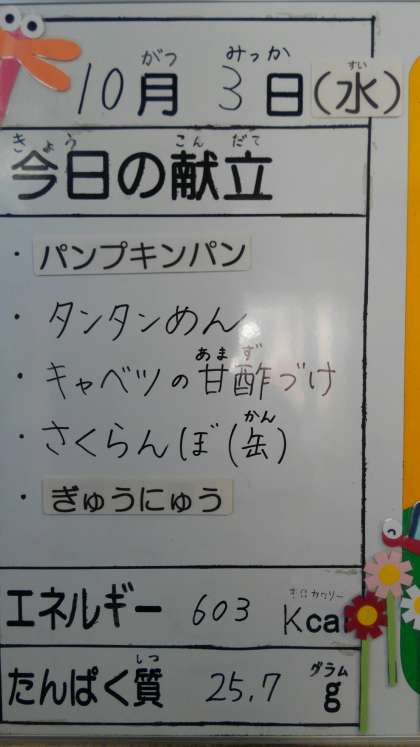 10月3日(水曜)の給食