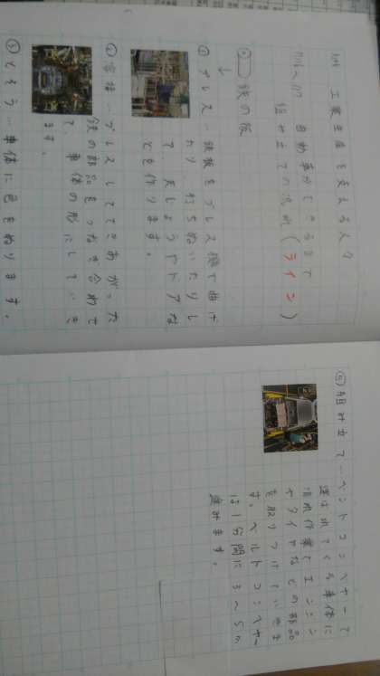 自動車の生産ラインについて調べて、ノートにまとめています。