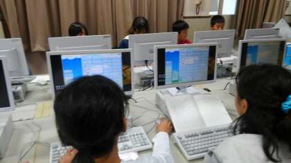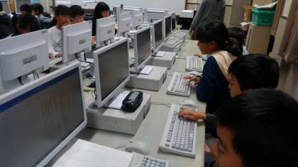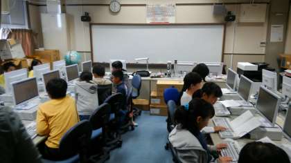 国語科で「注文の多い料理店」の学習をしたあと、ひとりひとりが「不思議な世界へ行く」というテーマで物語を書いています。パソコンに向かって、文字を入力する姿は、まるで作家のようです。