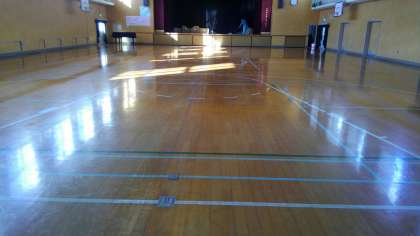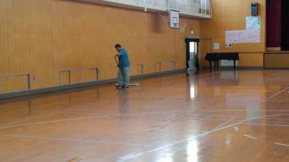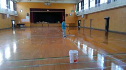 学習発表会に備えて、管理作業員さんがワックスをかけてくださいました。