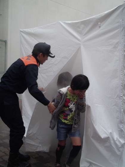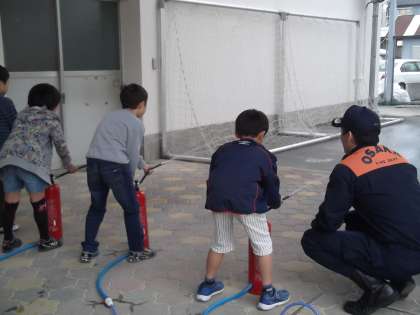 消防署の方に来ていただき、消防の仕事や災害にどのように備えたらよいか教えていただきました。また、煙体験や消火体験もさせていただきました。消火器を使うときの合言葉は「ピン・ポン・パン」をみんなで覚えておきましょう。