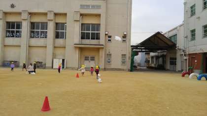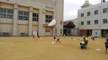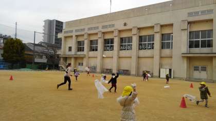 昼休みに、東小橋幼稚園の年中組さんが、凧上げをするために小学校に来ました。みんな運動場を走りまわって凧を高く上げていました。寒さに負けずにがんばれ。
