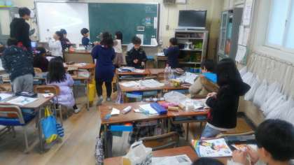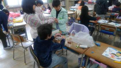 1年生と一緒に遊べるおもちゃを作っていました。完成したパチンコを試していました。みんな上手に作って、たまを遠くまで飛ばしていました。