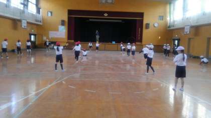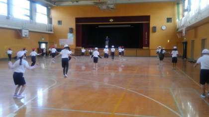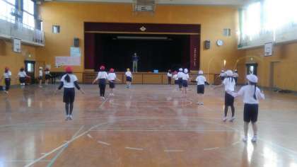 音楽のリズムにあわせて、いろいろな縄跳びの跳びかたを練習していました。