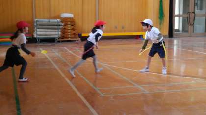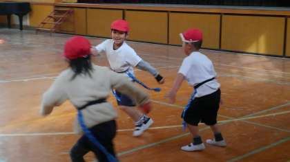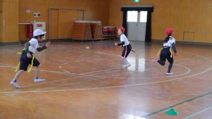 フラッグフットボールをしていました。先生にビデオを撮影てもらい、守り神が王様をドラゴンから守って、腰につけたひもを取られないように動きを工夫していました。