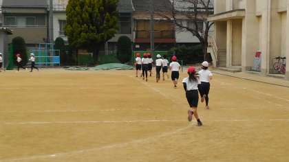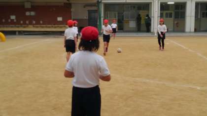 1時間目、3年生が準備運動で、10分間で各自のペースで走って何周走れるか競っていました。そのあとサッカーボールのパス練習をして、最後にサッカー型ゲームをしていました。