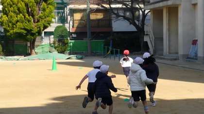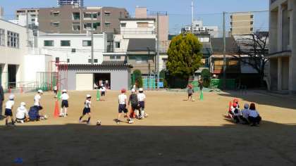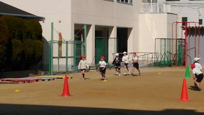 準備運動で1分間走のあと、サッカーボールをドリブルしながらリレ—をしていました。そのあと、みんなでドリブルを上手にやるには、どうすればよいか考えていました。