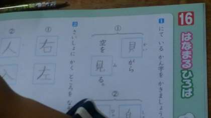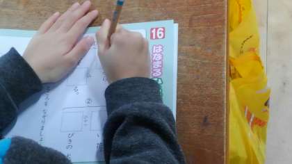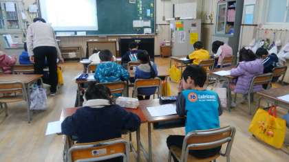 1時間目、1年生が国語の授業で漢字ドリルをしていました。それが終わったあと、5時間目の「かかりの発表会」のリハ—サルを班ごとに練習していました。