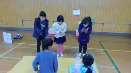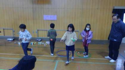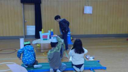 1・2年生が講堂で一緒に生活科の学習をしていました。2年生が作ったおもちゃを、1年生に遊びかたを教えて遊ばせていました。1年生は2年生から教えてもらってみんな楽しそうでした。