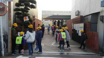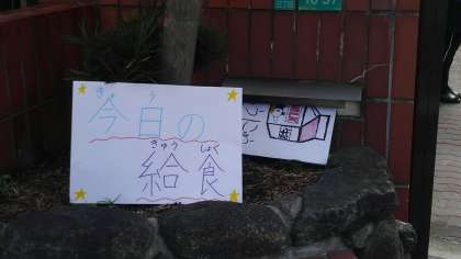 今日は、正門付近に、今日の給食メニュ—を描いた絵を隠して、それを見つけるゲームをしていました。