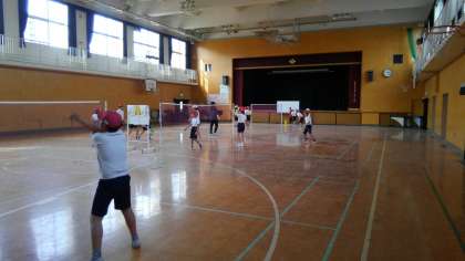サーブを手で受けて、トスをあげてスパイクを打ちます。ネットの高さはバドミントンのネットを使っています。