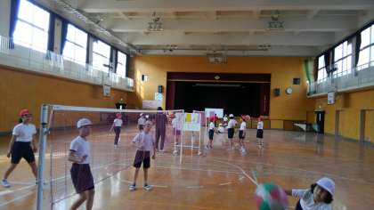 5時間目、講堂で4年生が体育の授業でバレーボールに似たスポーツをしていました。