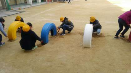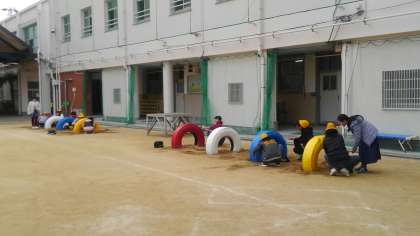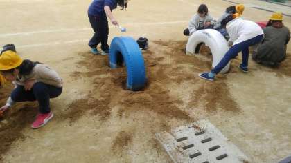 6時間目、6年生が、今まで使っていたタイヤ、ジャンピングボードの塗料が薄くなっていたので、塗料を塗り直してくれました。