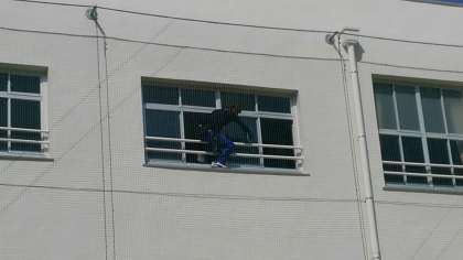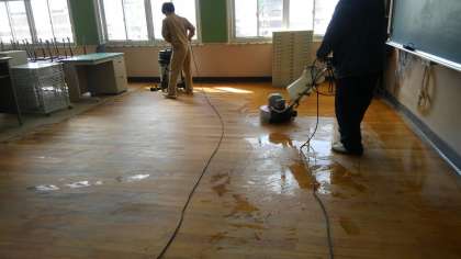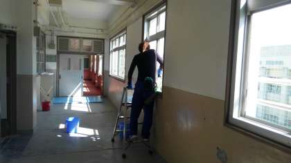 校舎の窓ガラスふきや教室のワックスがけを、業者の方々にしていただきました。