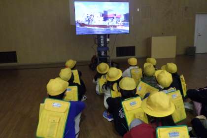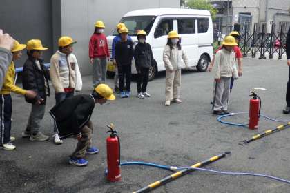 まず、消防士のお仕事についてのDVDを見せてもらい、その後水消火器の体験をさせてもらいました。