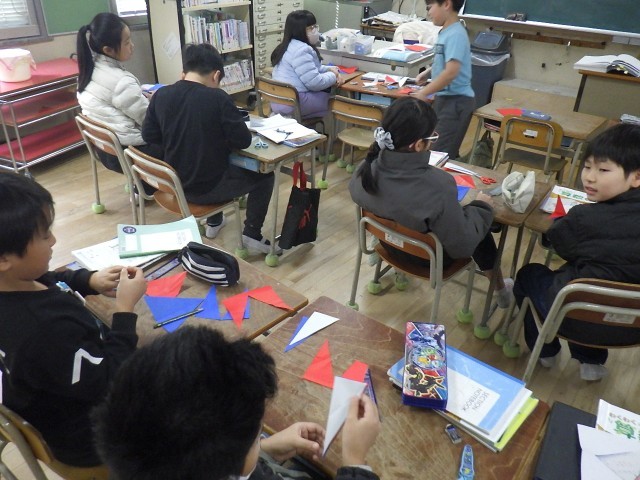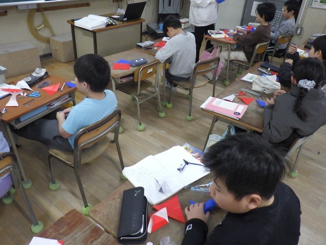 赤と青の折り紙を折ったり切ったりしていたのでしばらく見ていると二等辺三角形と正三角形が完成しました。