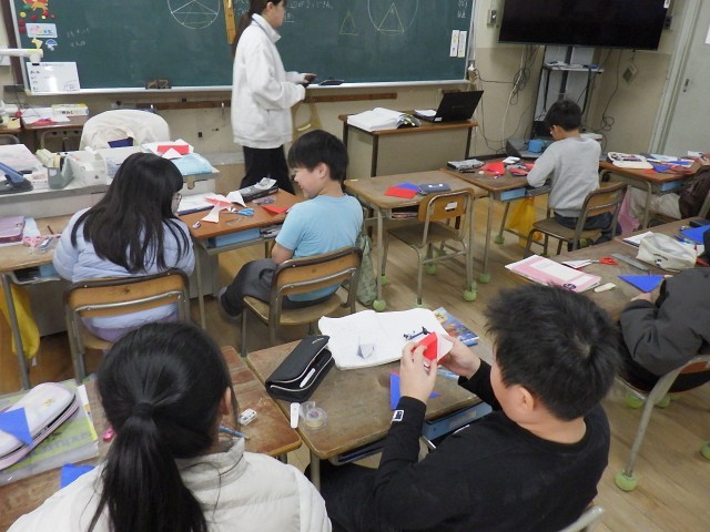 二つの図形を比較したりそれぞれの辺の長さや角の大きさを調べたりしながら図形の特徴について考えを深めていっていました。