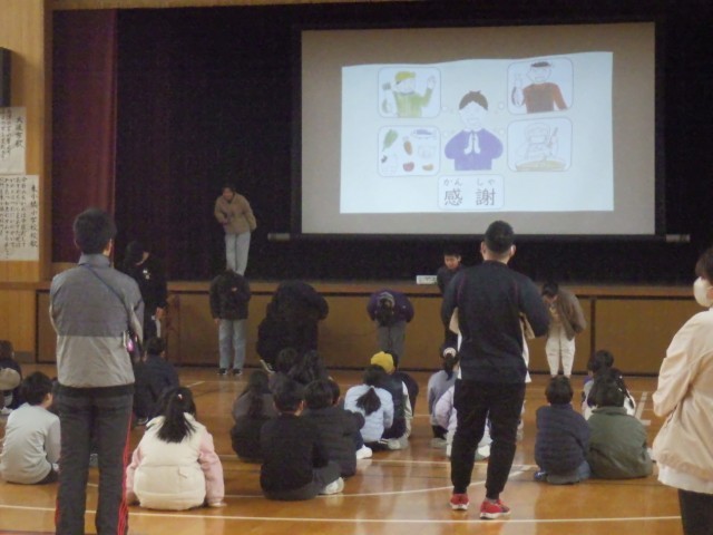 1月24日から30日の期間は学校給食週間になることから児童集会で健康委員会の発表がありました。