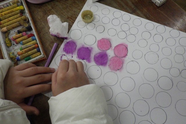 円をたくさん描き、クレパスを使って塗っていっていました。