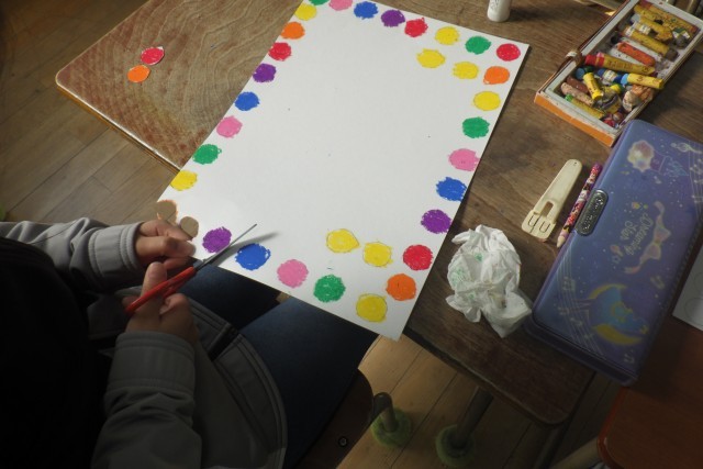 その後、ティッシュペーパーを使って色をぼかしたりハサミで円を切ったりする様子が見られました。
