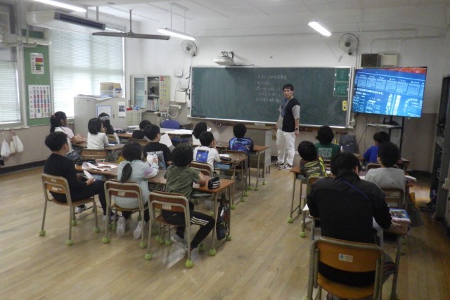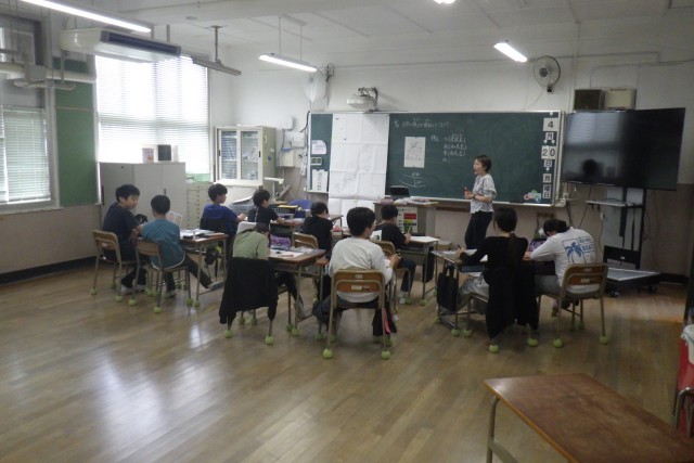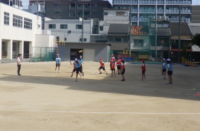 6年生体育の学習はドッヂビーを使っての対戦型競技。フリスビーと違って、当たっても痛くないので安全に活動できるドッヂビー。2チームに分かれて今日も楽しく学習を進めていました。