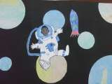 マーブリングした紙を星にして、宇宙を作りました。 宇宙服を着ているのは自分自身で...