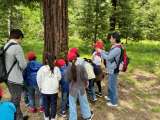 アンモナイトの化石を触って喜んでいる子や、恐竜の足あとに入ってみて楽しんでいる子...
