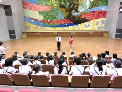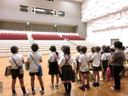 区民センターでは、大ホールの中の様子を見学しました。舞台の上に上がり、控室や荷物運搬用の大きなエレベーターなど普段は見られないところも見せてもらいました。椅子がリモコンで収納されるのを見て、子どもたちは驚きの声を挙げていました。
