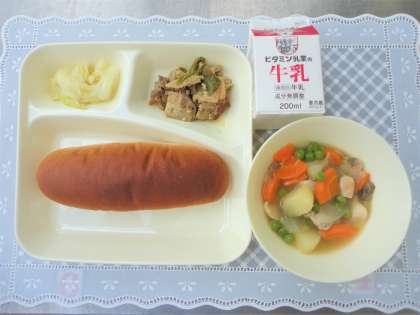 黒糖パン・牛乳・豚肉のカレー風味焼き・スープ煮・サワーキャベツ