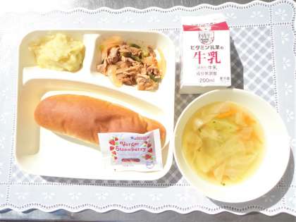 コッペパン・いちごジャム・牛乳・豚肉と野菜のケチャップソテー・スープ・スイートポテト