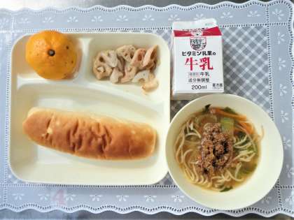 おさつパン・牛乳・タンタンめん・れんこんのオイスターソース焼き・みかん