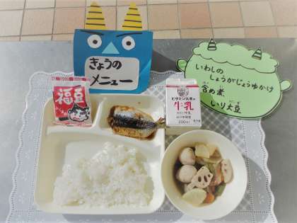 ごはん・牛乳・いわしのしょうがじょうゆかけ・含め煮・いり大豆