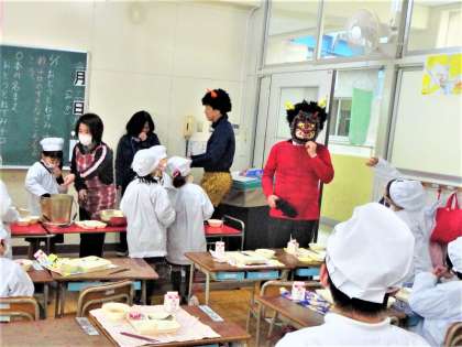 2月3日は節分です。給食室前には鬼のお面が飾られ、献立には節分にちなんだ「いわしのしょうがじょうゆかけ」と「いり大豆」が出ました。