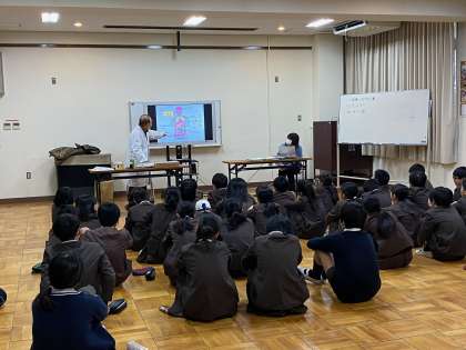 学校薬剤師の先生に来ていただき、正しいお薬の飲み方や、薬物乱用防止についてなどお薬について教えていただきました。水やお茶、ジュースでお薬を飲む簡単な実験も見せてくださいました。お薬について考えるよい機会になりました。