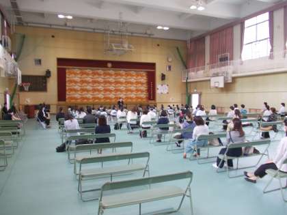 講堂で全体会をしてから、感染症の拡大予防のため各クラスともA,B分かれ、教室で担任の話を聞きました。