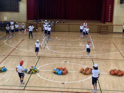 テーマは「体づくり」で、遊びの中で運動能力を高めるために、フラフープやボールを活用して運動をしました。