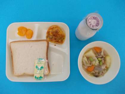 今日は食パン、マーガリン、豚肉と野菜のスープ煮、変わりピザ、みかん(缶)でした。