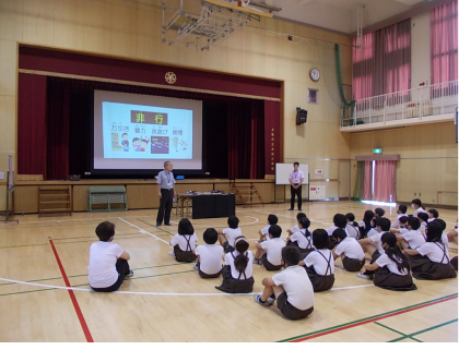 本日は5年生を対象にした、非行防止・犯罪被害防止教室でした。大阪府中央サポートセンターの方が、非行とはどんな行為か、特に万引きについてペープサートなどを使って分かりやすく説明してくださいました。また、社会的なルールを守ること、また、学校生活のルールをまず守ることがその第一歩だと教えていただきました。