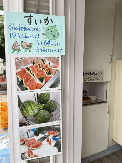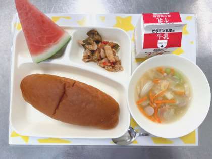 【黒糖パン、牛乳、鶏肉と夏野菜のソテー、押し麦のスープ、すいか】