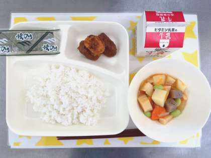 【ごはん、牛乳、みそカツ、じゃがいもと野菜の煮もの、焼きのり】